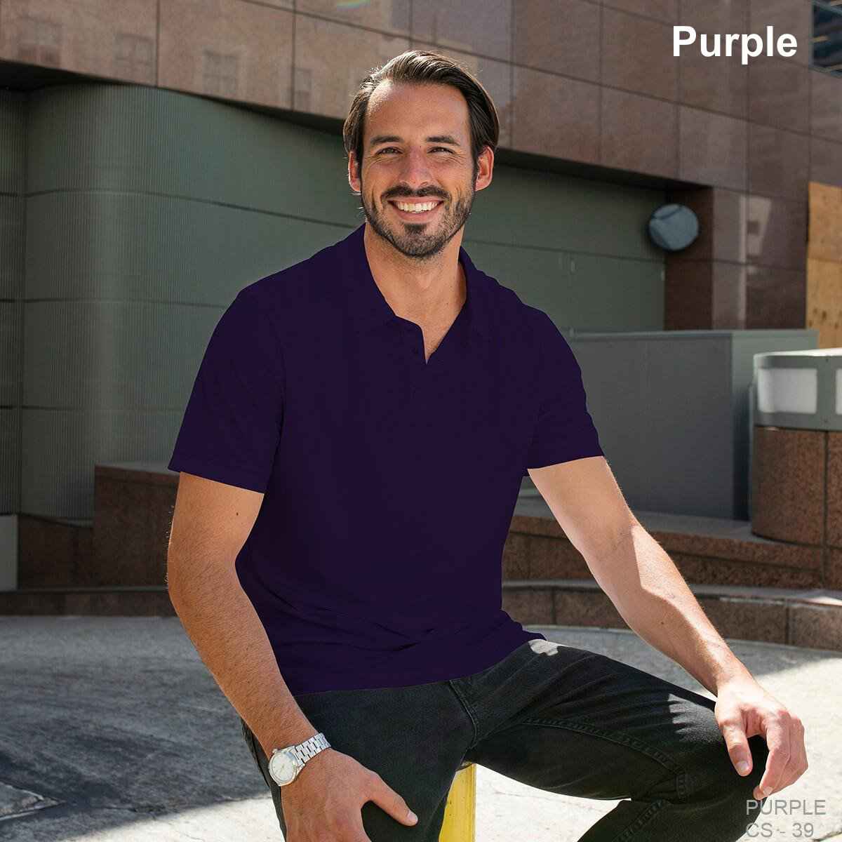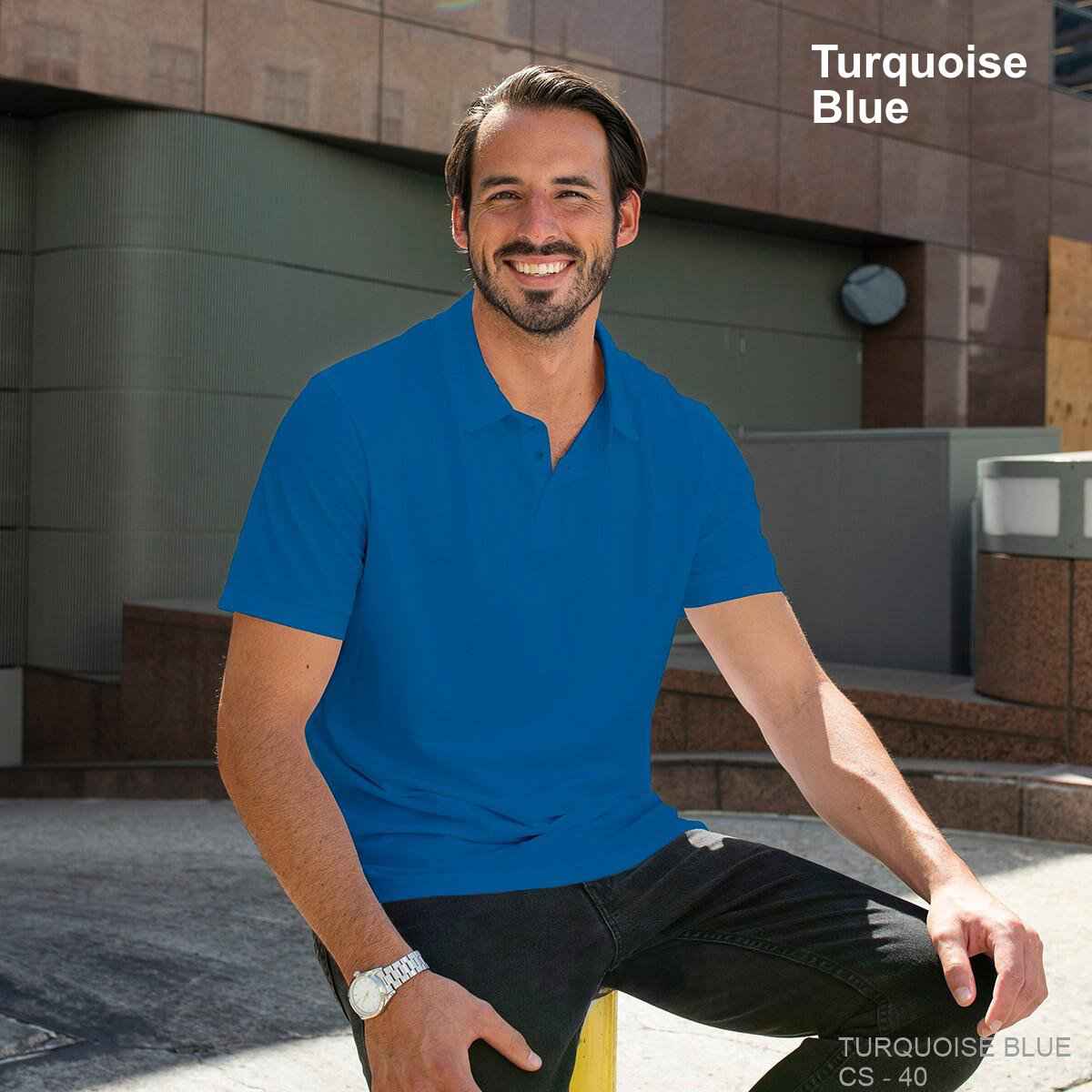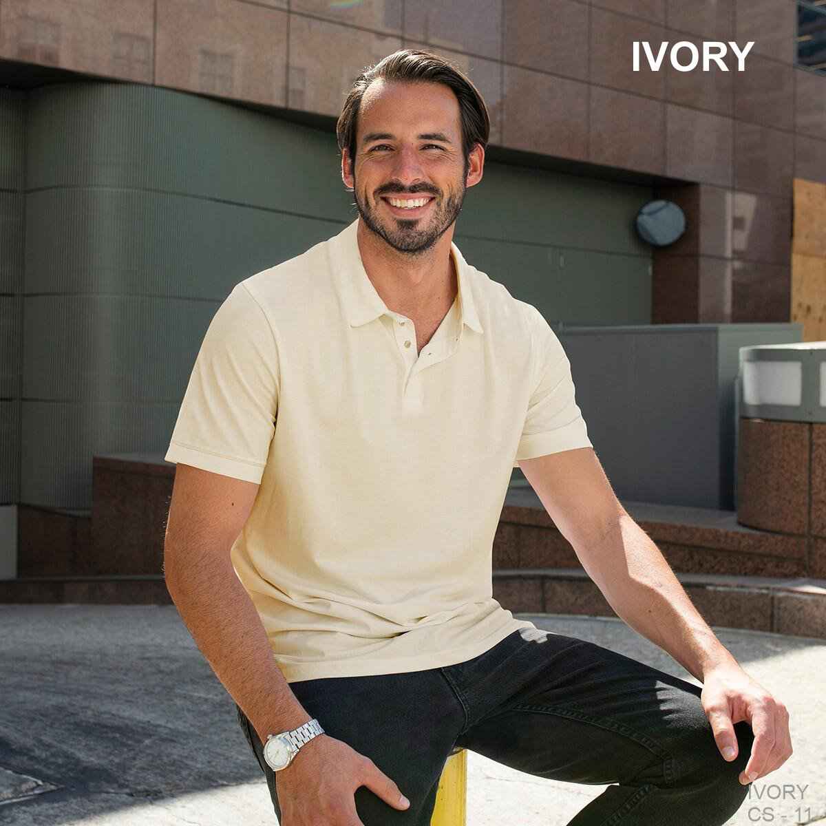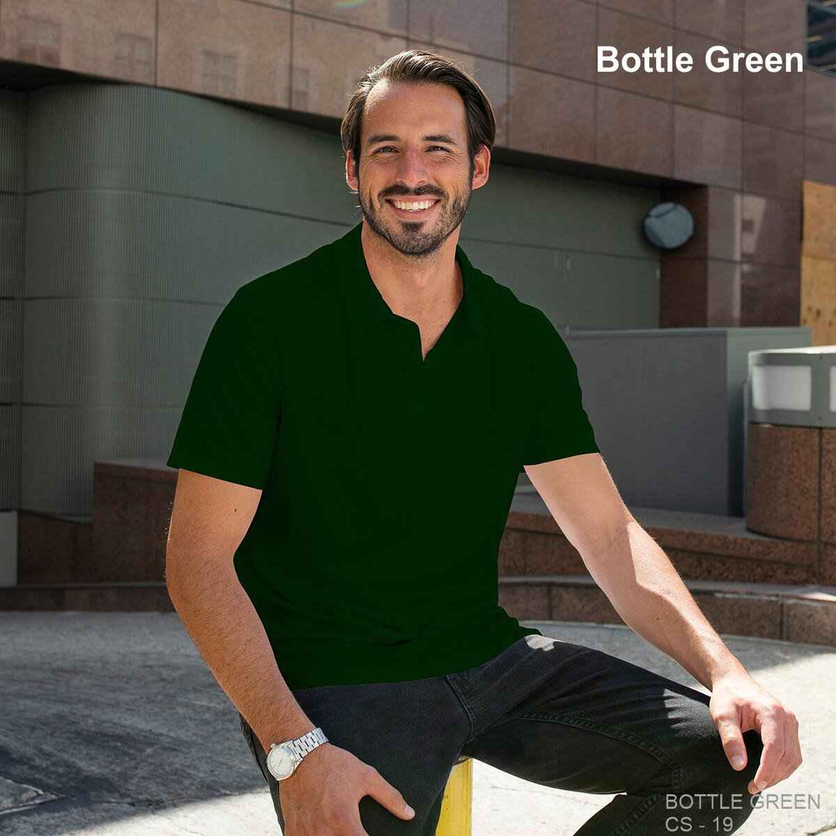 - Three-button placket with bottom and buttons that match the dye