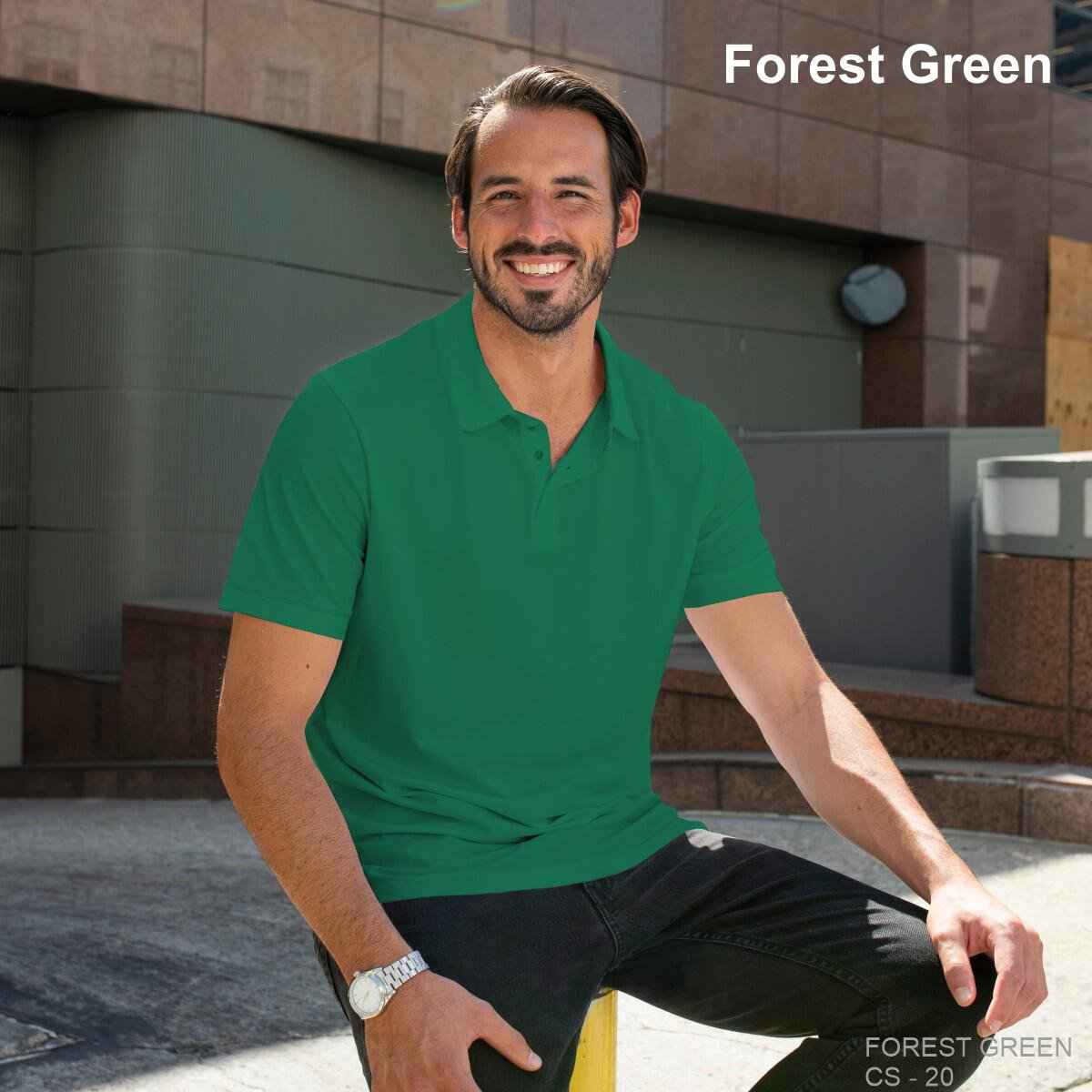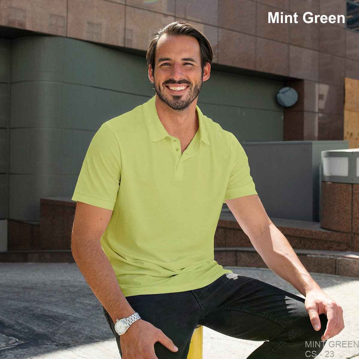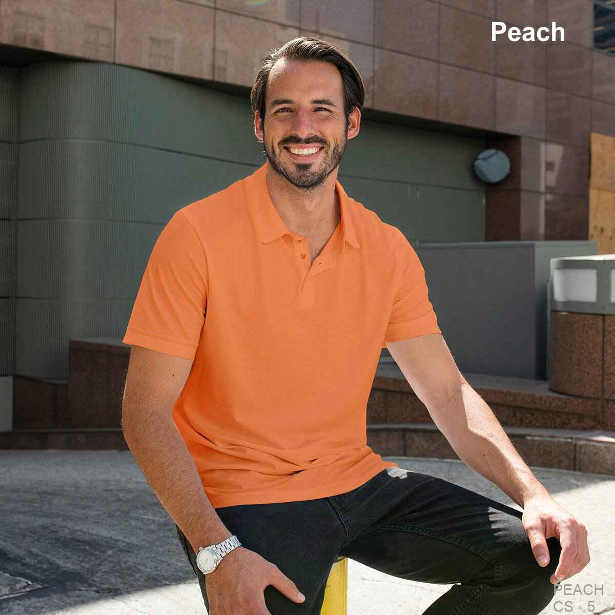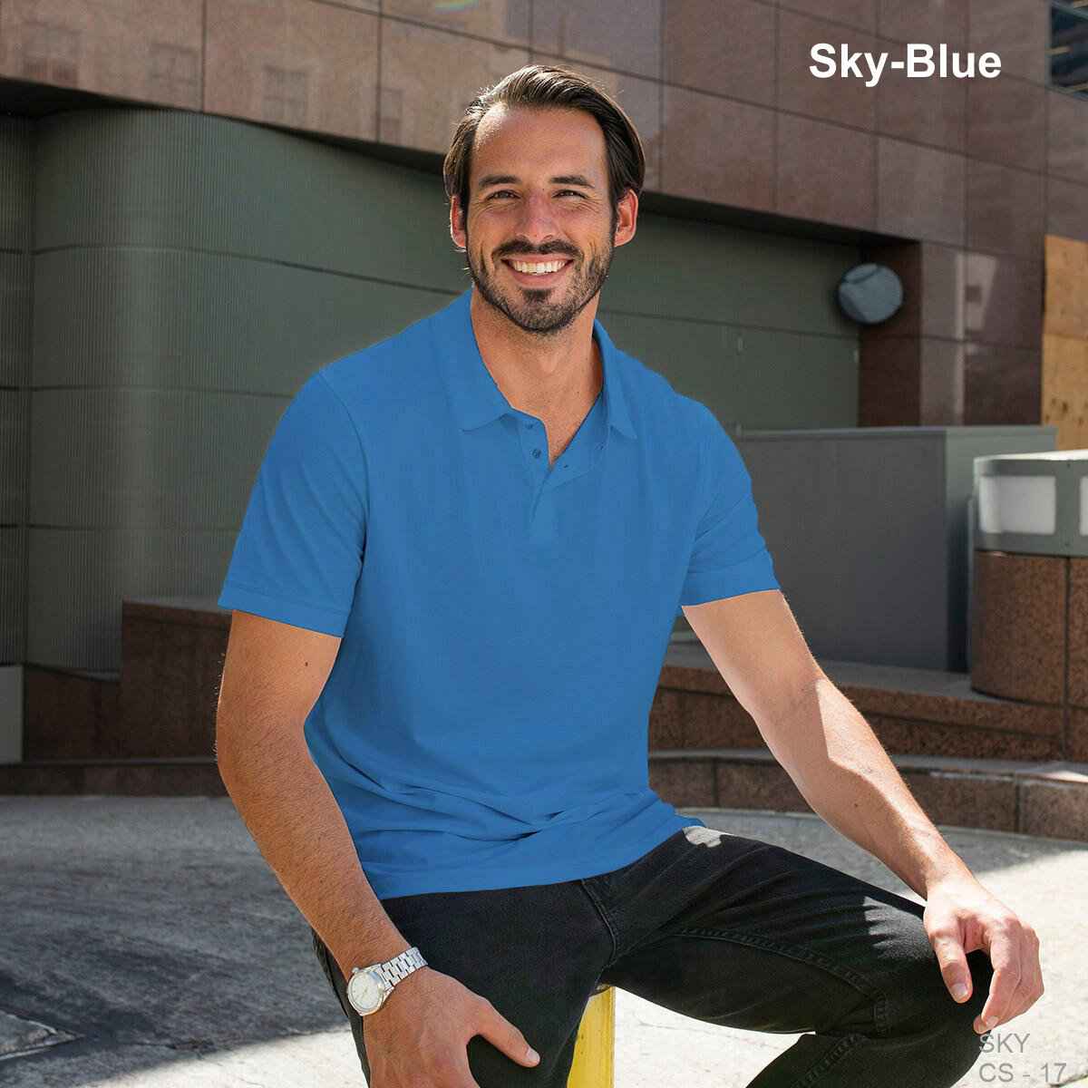 - Three-button placket with bottom and buttons that match the dye
